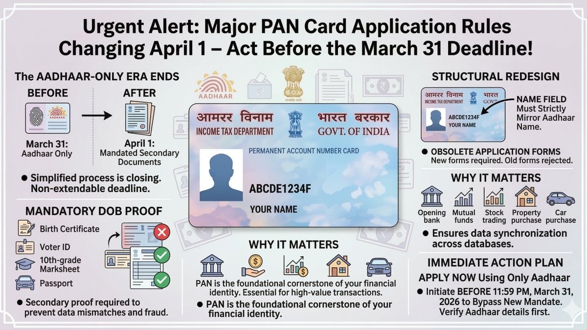 સમગ્ર દેશમાં લાખો નાગરિકોને સીધી અસર કરતા એક મોટા અને મહત્વપૂર્ણ નિર્ણયમાં, પરમેનન્ટ એકાઉન્ટ નંબર (PAN) એટલે કે પાન કાર્ડ માટે અરજી કરવાની પ્રક્રિયામાં 1 એપ્રિલ, 2026 થી મોટા ફેરફારો થવા જઈ રહ્યા છે. છેલ્લા ઘણા વર્ષોથી, આધાર કાર્ડ એકમાત્ર એવો દસ્તાવેજ રહ્યો છે, જેના આધારે કોઈપણ વ્યક્તિ સરળતાથી પાન કાર્ડ મેળવી શકતી હતી. આ પ્રક્રિયાને કારણે અરજદારોનો ઘણો સમય બચતો હતો અને કોઈ વધારાના કાગળોની જરૂર પડતી ન હતી. જોકે, હવે આ સરળ પ્રક્રિયાનો અંત આવવા જઈ રહ્યો છે. નાગરિકો પાસે માત્ર આધાર કાર્ડના આધારે પાન કાર્ડ કઢાવવા માટે 31 માર્ચ, 2026 સુધીનો જ સમય છે. ત્યારબાદ નવા અને કડક નિયમો અમલમાં આવશે. "જો તમારે પાન કાર્ડ કઢાવવું હોય તો 31 માર્ચ પહેલાં માત્ર આધાર કાર્ડથી અરજી કરી દો, નહીંતર આવતા મહિનાથી તમારે લાંબી અને જટિલ પ્રક્રિયામાંથી પસાર થવું પડશે," આ એક સ્પષ્ટ અને તાત્કાલિક સલાહ છે જે દરેક નાગરિકે ધ્યાનમાં રાખવી જોઈએ.